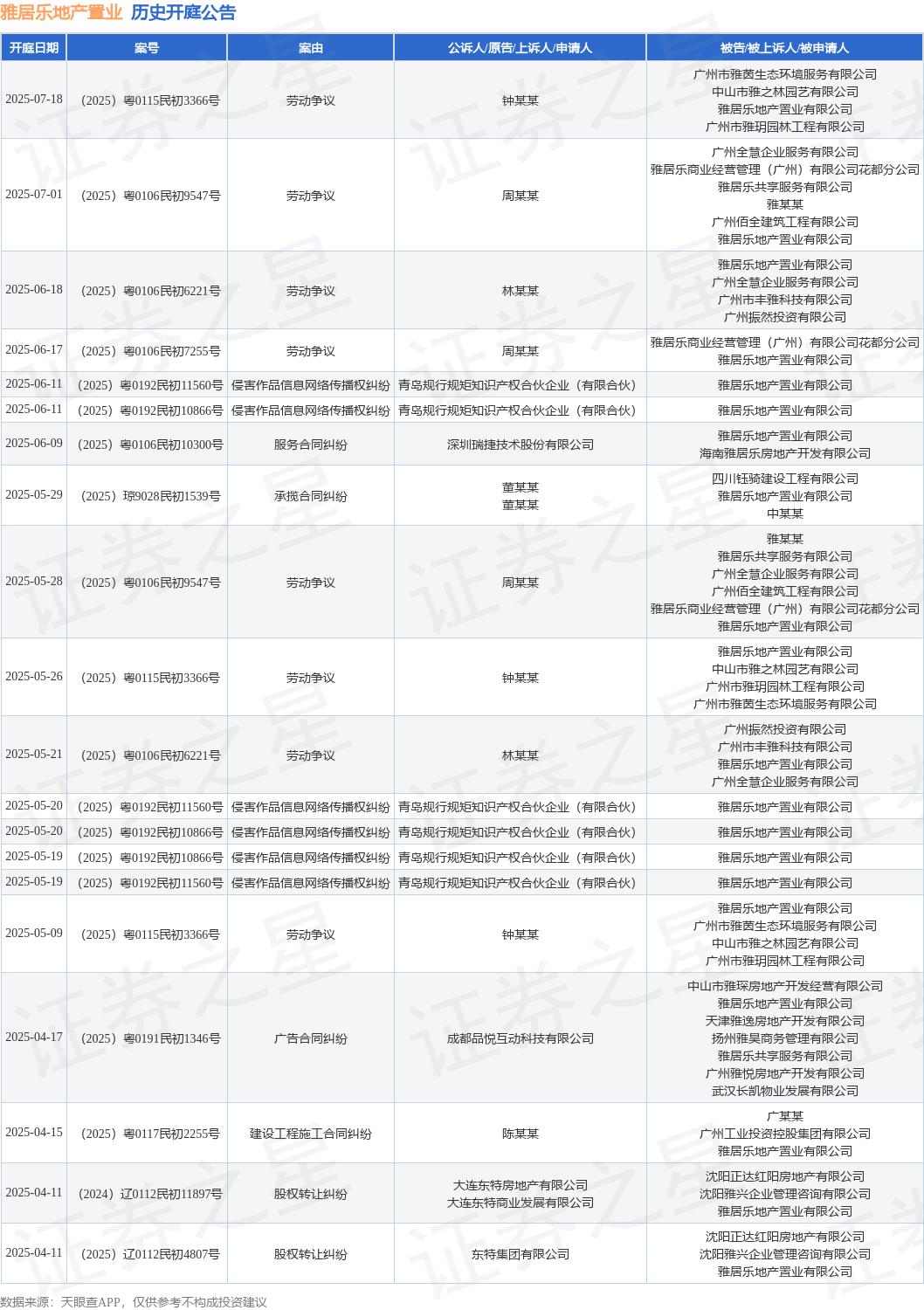 案号:(2025)粤0106民初7255号审理法院:广州市天河区人民法院案由:劳动争议当事人信息: 原告/上诉人:周某某 被告/被上诉人:雅居乐商业经营管理(广州)有限公司花都分公司、雅居乐地产置业有限公司开庭日期:2025年6月17日根据统计,近一年内以雅居乐地产置业有限公司为当事人的历史开庭公告有59则,其中案由为“劳动争议”的公告以13则居首,其次为“建设工程施工合同纠纷”有7则,“侵害作品信息网络传播权纠纷”有6则。历史开庭公告(前20条)如下: